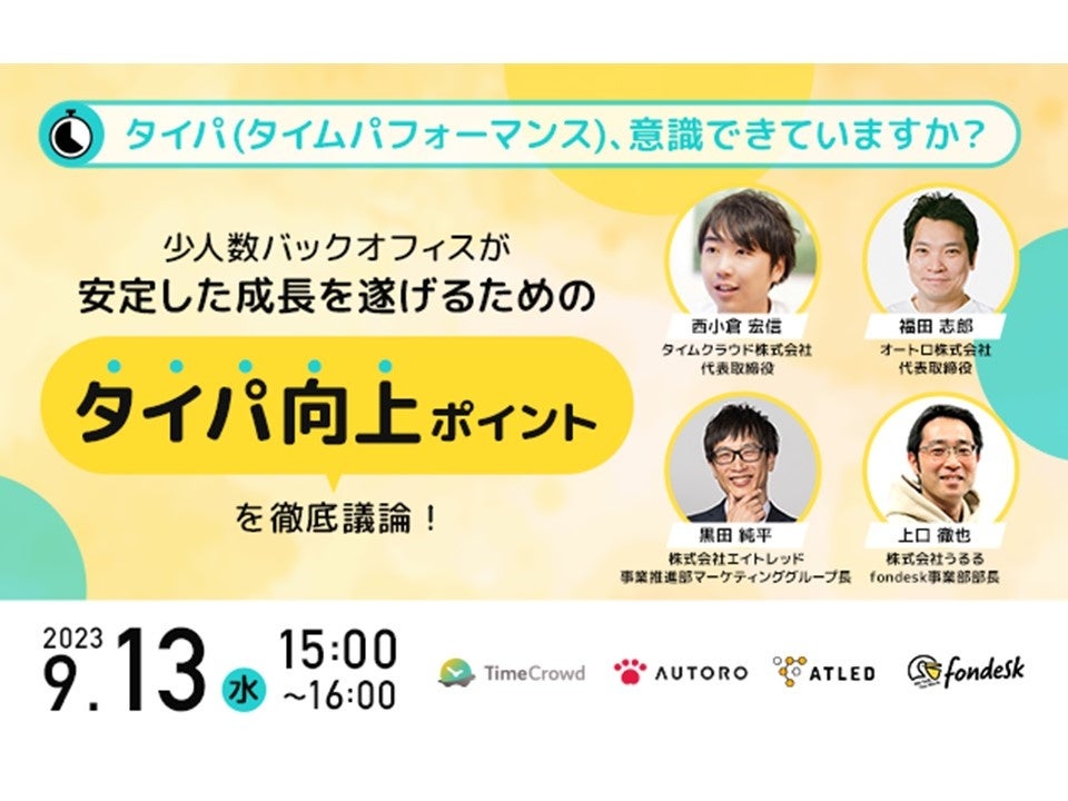 労働力不足問題解決のリーディングカンパニーとして、複数のSaaSを展開する株式会社うるる(東京都中央区 代表取締役社長:星 知也)が運営する電話代行サービス「fondesk」は、2023年9月13日(水)に、株式会社エイトレッド、オートロ株式会社、タイムクラウド株式会社と共催でオンラインセミナー『少人数バックオフィスが安定した成長を遂げるためのタイパ向上ポイントを徹底議論!』を開催いたします。