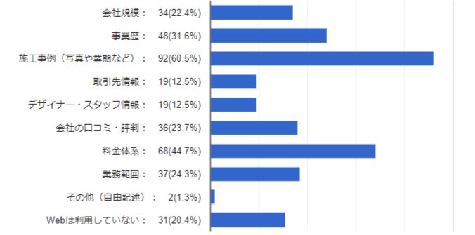 内装会社を選ぶ基準として、半数近くの方が「似た業態の実績がある(46.1%)」「デザインが自分の好みと合う(45.4%)」と回答。また、商談前に、WEBで内装会社の「施工事例」を確認した方は6割を超える結果となりました。