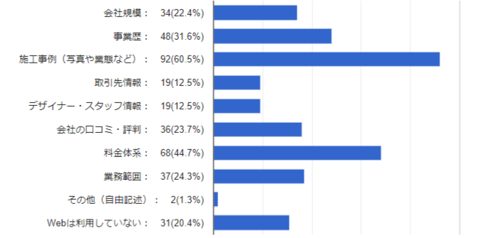 内装会社を選ぶ基準として、半数近くの方が「似た業態の実績がある(46.1%)」「デザインが自分の好みと合う(45.4%)」と回答。また、商談前に、WEBで内装会社の「施工事例」を確認した方は6割を超える結果となりました。