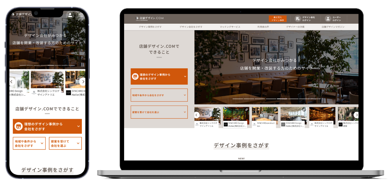 そこで今回のリニューアルでは、店舗デザイン.COMが保持する国内最大級の店舗内装事例データベースを活用し、「事例」を見やすく・比べやすいUIに一新。理想の店舗イメージに合った会社探しができるように改善しました。