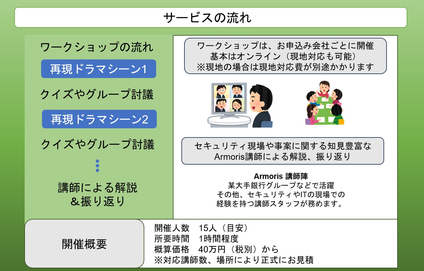 Armorisは、再現ドラマを観ながら、この状況で自分ならどうするかを考え、講師の解説や他の受講者の意見も聞くことが可能な「動画を用いたセキュリティワークショップシリーズ」を展開しています。その一環として、新たに社員の意識向上につながる「情報セキュリティ啓発ワークショップ」をリリースいたしました。「テレワーク」「USBメモリ紛失」「SNSの取り扱い」といったシナリオをご用意しています。