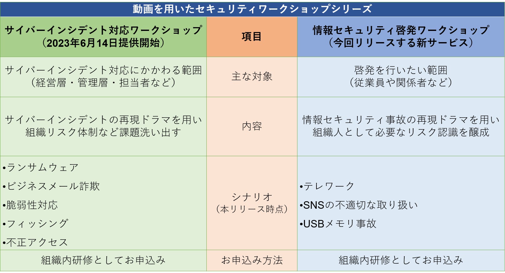 架空のセキュリティ事故対応の動画を使用したワークショップです。基本的にオンライン(Zoom)を用いて実施いたしますが、実際にご指定の研修場所に講師が訪問することも可能です。また、研修対象者のレベル等に応じて実施形式を選択可能(発言形式/クイズ形式/講師による解説のみ)です。