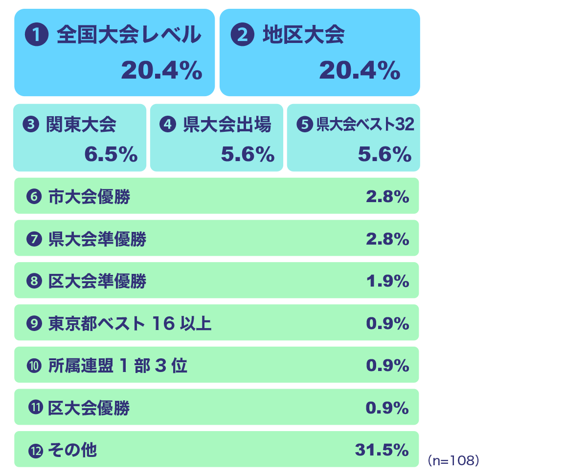 -全国大会レベルが20.4%、また地区大会も同じく20.4%と回答がありました。次いで、関東大会、県大会出場、県大会ベスト32という成績もありました。