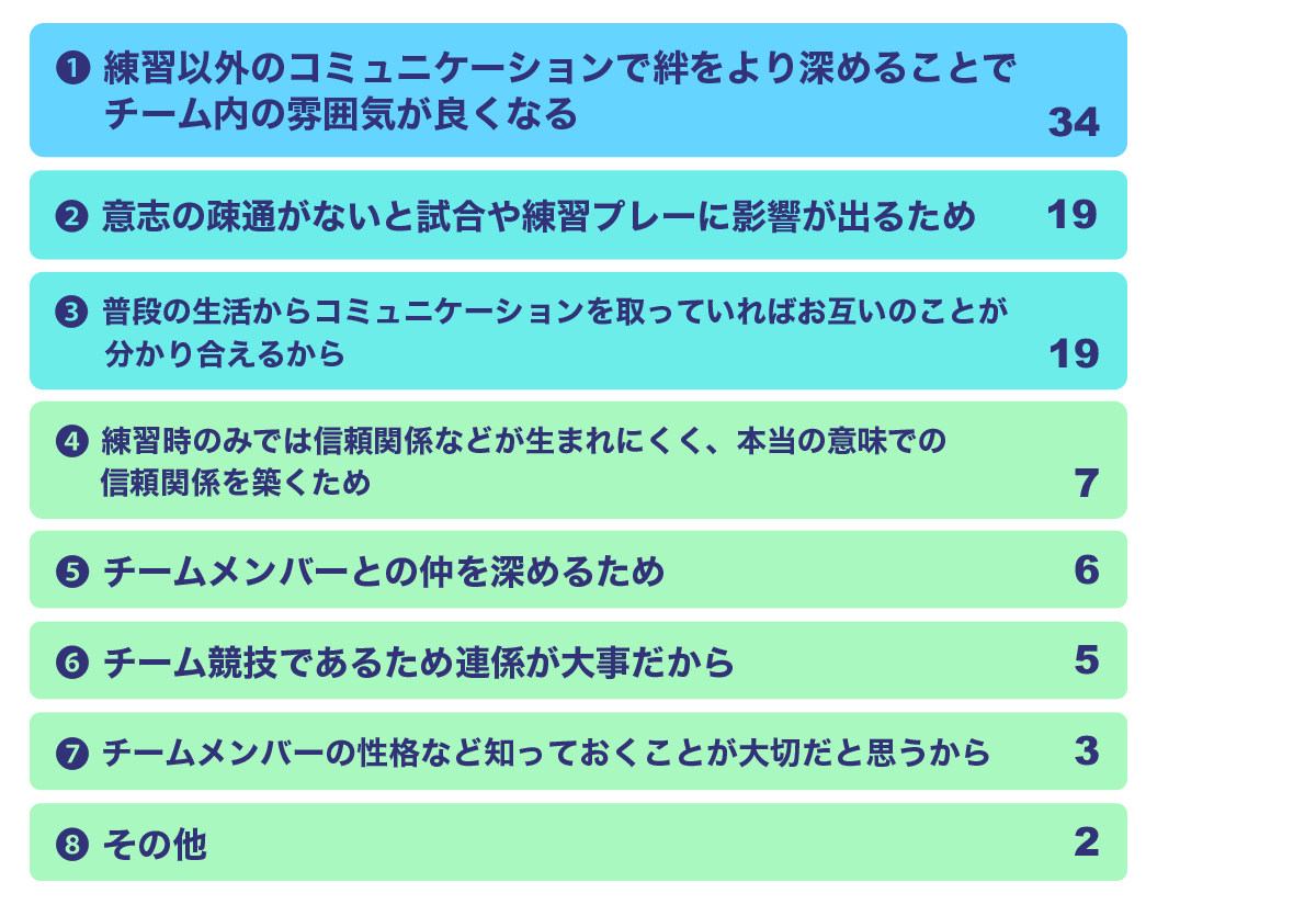 「練習以外のコミュニケーションで絆をより深めることでチーム内の雰囲気が良くなる」が34名で一番多い回答でした。次いで「意志の疎通がないと試合や練習プレーに影響が出るため」「練習以外のコミュニケーションで絆をより深めることでチーム内の雰囲気が良くなる」という回答でチーム雰囲気や試合の成績にも影響があるというが分かります。