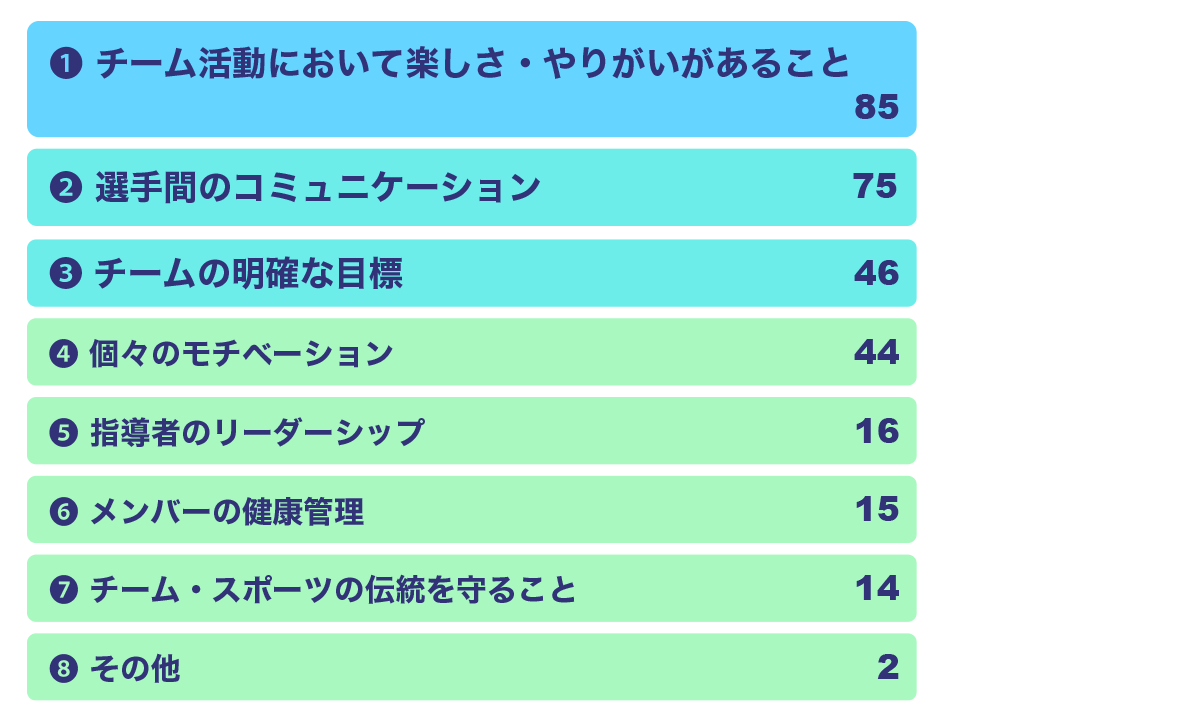 一番多かった回答は「チーム活動において楽しさ・やりがいがあること」で、次に「選手間のコミュニケーション」でした。また、「チームの明確な目標」「個々のモチベーション」の回答もあり、チームワークを上げるためにもコミュニケーションが欠かせないと言えます。