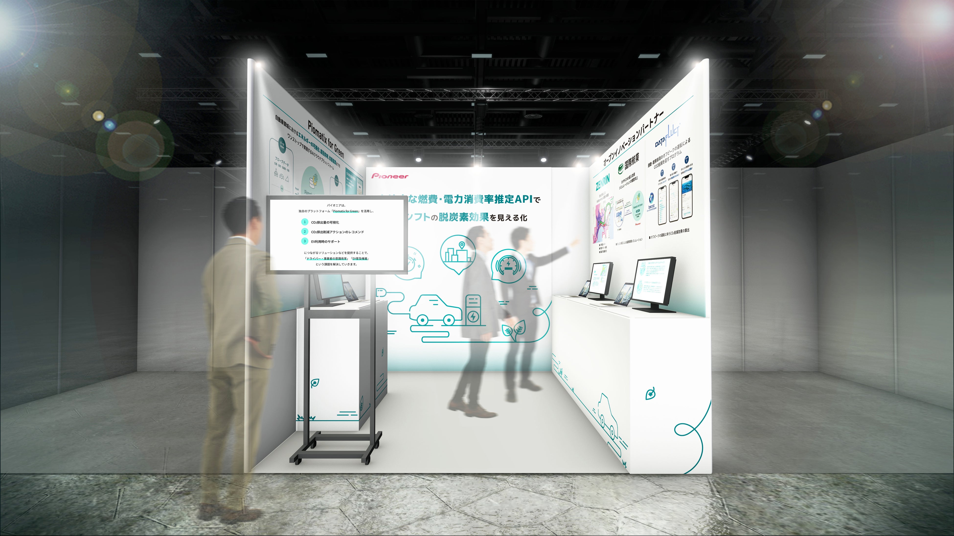 本展示会では、モビリティ領域における消費エネルギー、CO₂排出量の可視化から改善提案までをワンストップで実現する「Piomatix for Green」の概要と、同プラットフォームを活用した「CO₂排出量の可視化」「CO₂排出削減アクションのレコメンド」「EV利用時のサポート」などのEVシフトをサポートするソリューションを紹介します。また、さまざまなパートナー企業との連携による、同プラットフォーム、各ソリューションを活用した脱炭素化への取り組みも紹介します。