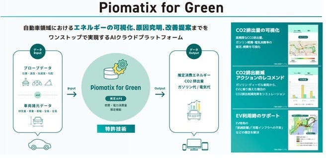 当社は、独自の燃費・電力消費率推定技術を用いたクラウドプラットフォーム「Piomatix for Green(パイオマティクス・フォー・グリーン)」を活用し、モビリティ領域の脱炭素化につながるさまざまなソリューション開発、イノベーションパートナーとの連携を進めています。