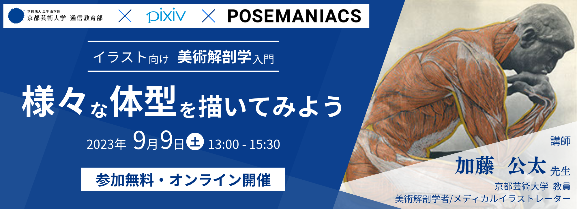 特別講師として、京都芸術大学 通信教育部イラストレーションコースの教員である美術解剖学者/メディアカルイラストレーターの加藤公太先生を招き、POSEMANIACSが提供する3Dポーズ素材を使って、イラストを描く力を向上させます。京都芸術大学 通信教育部の強みである、先生からの丁寧な講評を受けることができるため、イラストの基本である人体の描き方を学び、自身の作品を向上させたい方はぜひご参加ください。