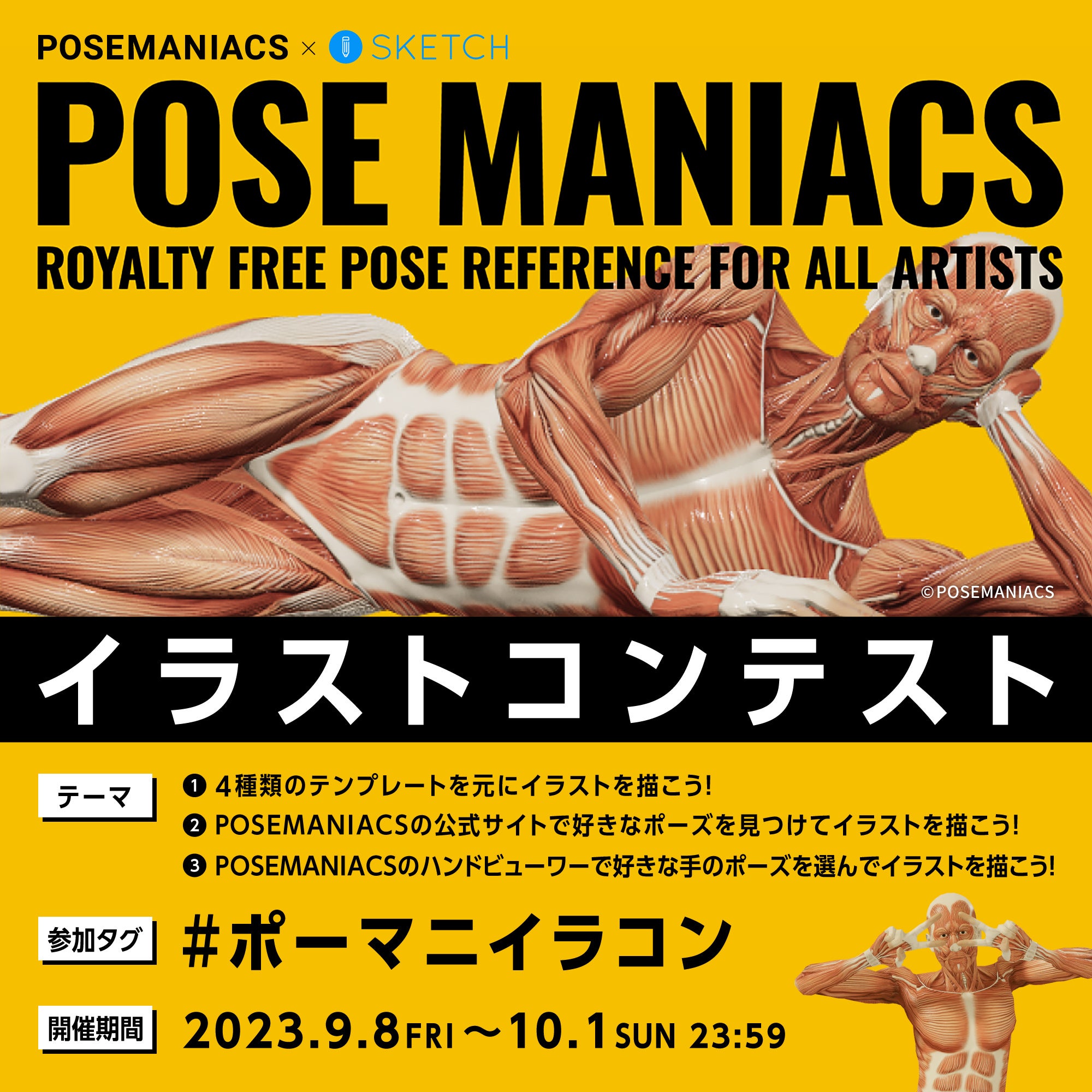お絵かきコミュニケーションアプリ「pixiv Sketch」にて、 POSEMANIACS提供の素材を活用したイラストコンテストを9月8日(金)から10月1日(日)まで開催します。また、ピクシブが業務提携する、学校法人瓜生山学園 京都芸術大学 通信教育部 イラストレーションコースによるオンライン授業で、POSEMANIACSのポーズ素材を活用した特別講義を開催します。