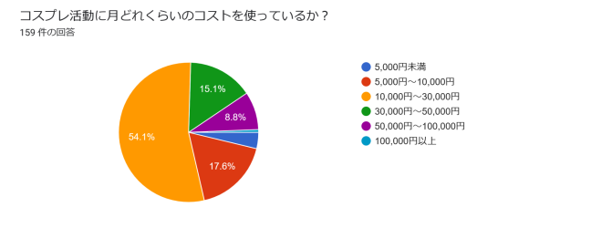 コスプレ活動に月にどのくらいのコストをかけているか質問したところ、「10,000~30,000円」が54.1%で最多、次いで「5,000~10,000円」が17.6%、「30,000~50,000円」が15.1%という結果となりました。1万円以上のコストをかけている人を合算すると78.6%でした。