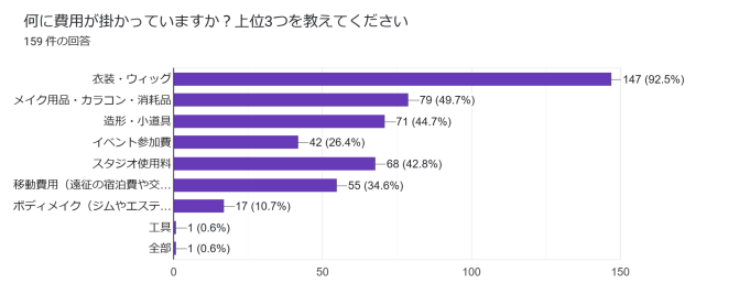 費用の使い道の内訳として多かったのは「衣装・ウィッグ」、「造形・小道具」、「メイク用品・カラーコンタクト」といった消耗品などでした。またスタジオ使用料などにも多くの費用が罹っていることがわかります。