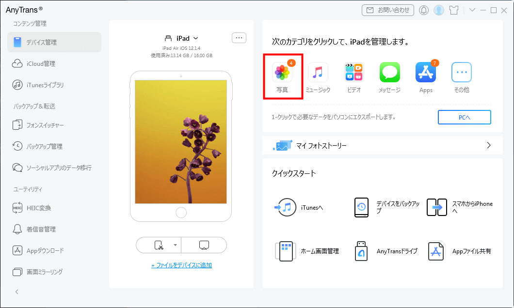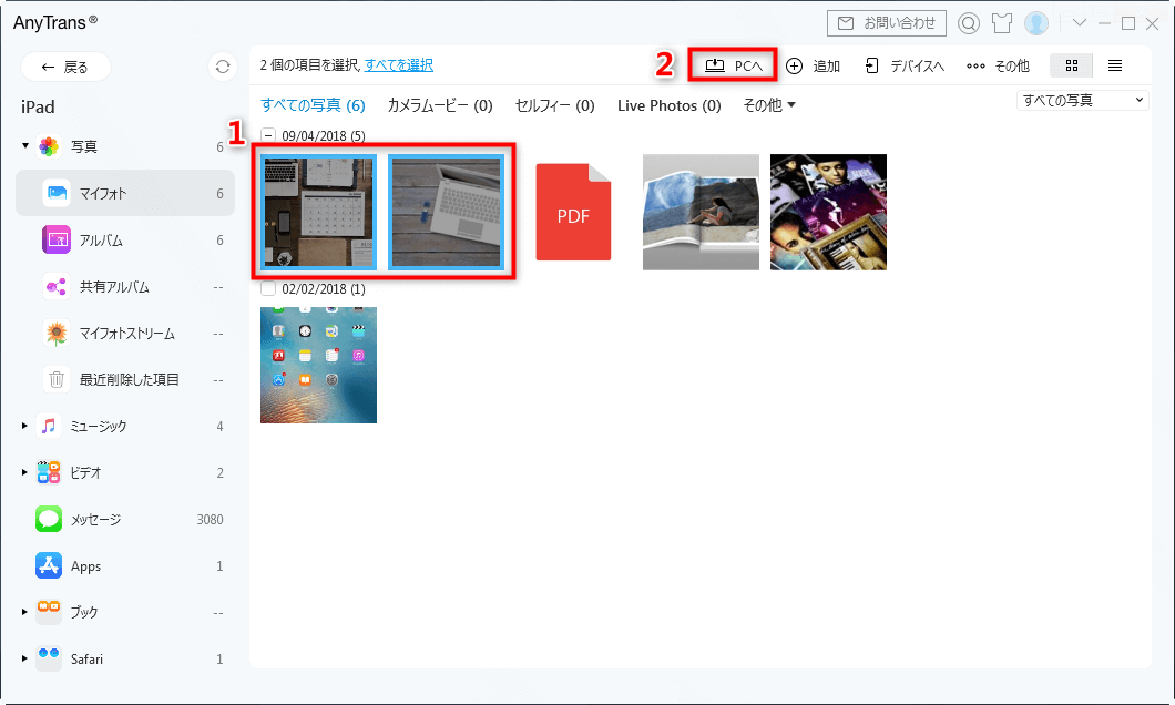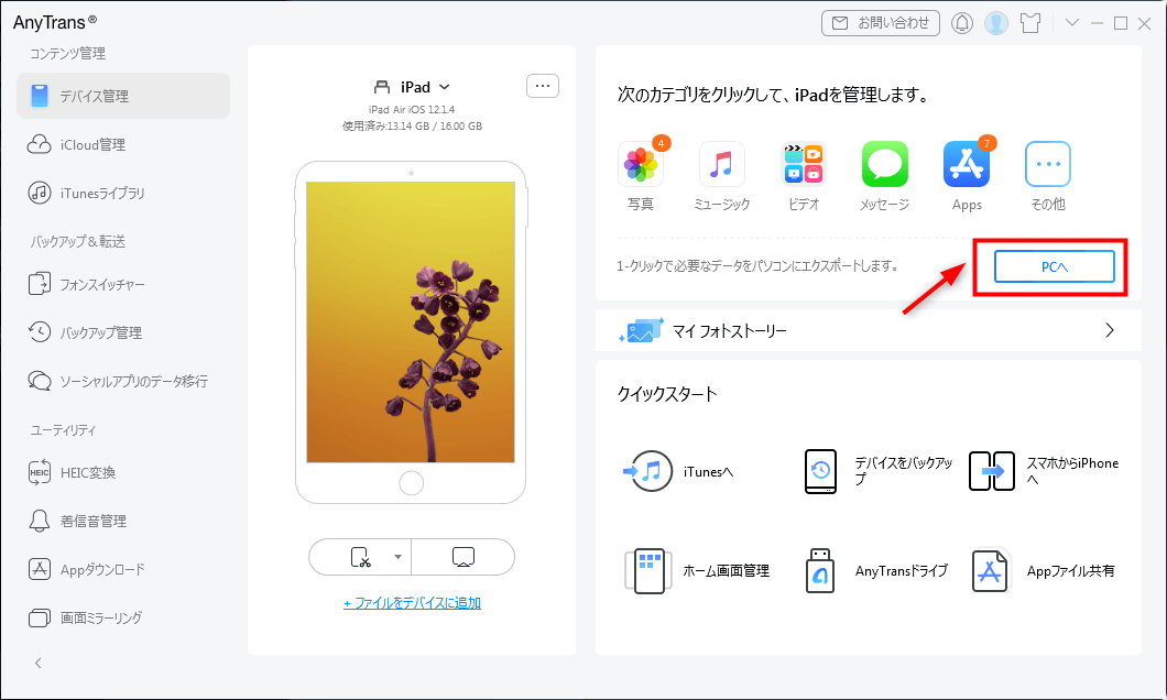 ステップ1、iPadとパソコンを接続してから、AnyTransを立ち上げ、「PCへ」をクリックします。