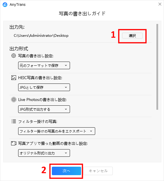 ステップ2、パソコンに転送したいデータを選択し、出力先をUSBメモリーのアドレスに設定します。設定が終わったら、「次へ」をクリックします。