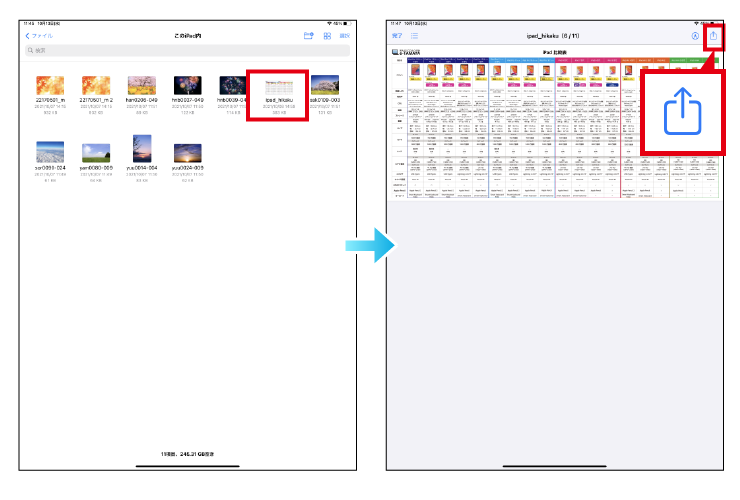 ステップ2、ファイルの「場所」から「このiPad」を選択し、次はUSBに保存したいデータを選択し、右上にある共有ボタンをタップします。