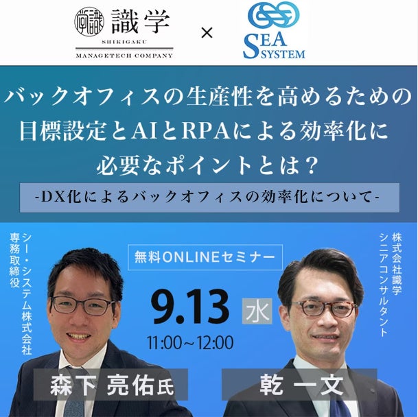 次世代型データ入力自動化ツール「AI JIMY Paperbot」を提供するシー・システム株式会社(本社:⼤阪府⼤阪市北区 代表取締役:森下 康夫 URL: https://seagp.com/)は、マネジメントコンサルティングを行う株式会社識学(本社:東京都品川区 代表取締役社長 安藤 広大 URL: https://corp.shikigaku.jp/)と合同で、2023年9月13日(水)に無料オンラインセミナーを開催いたします。株式会社識学 シニアコンサルタント乾 一文氏、シー・システム株式会社 専務取締役 森下 亮佑氏がそれぞれの専門分野から業務効率化におけるポイントについて語ります。