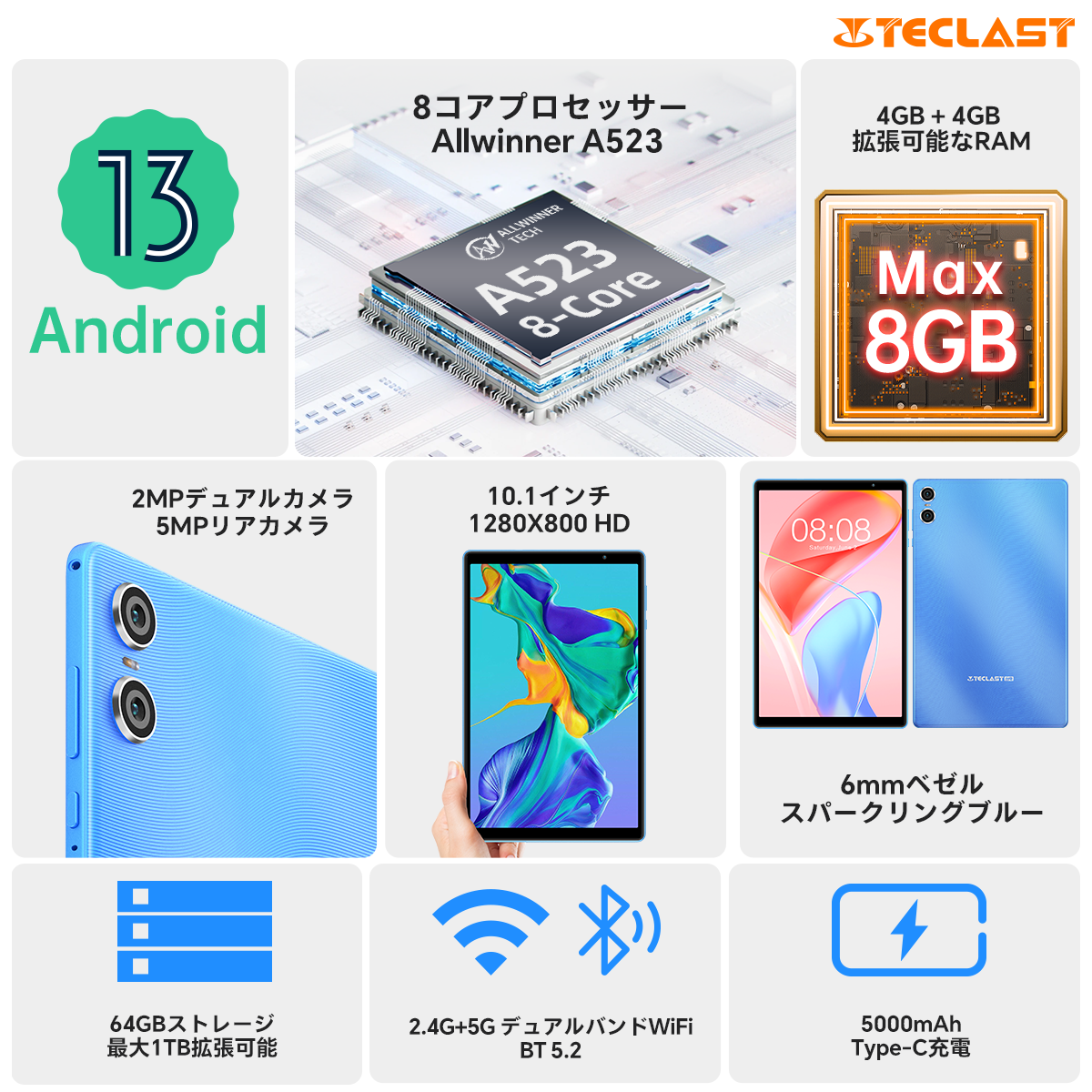 10インチ / Android 13 / 8GB(4+4GB拡張)RAM+64GB ROM+1TB拡張 / WideVine L1対応 / WiFiモデル / デュアルカメラ / 画面分割 / 3.5mmヘッドフォンジャック / 児童守護