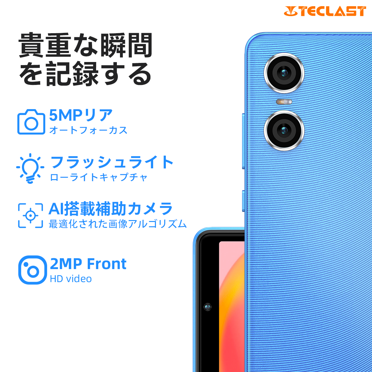 5MPオートフォーカスデュアルカメラは、最先端のデュアルリングデザインを採用し、AI機能で強化され、正確で鮮やかなキャプチャーが可能です。前面の2MP HDビデオカメラは、フラッシュと組み合わせることで、写真の撮影や以前の瞬間を記録するためのより良いサポートを提供します。フロントカメラは顔認証によるロック解除に対応しています。設定で顔情報を安全に登録し、顔をサッとスキャンするだけで、パスワード情報の入力に煩わされることなく、簡単にタブレットシステムにアクセスできます。