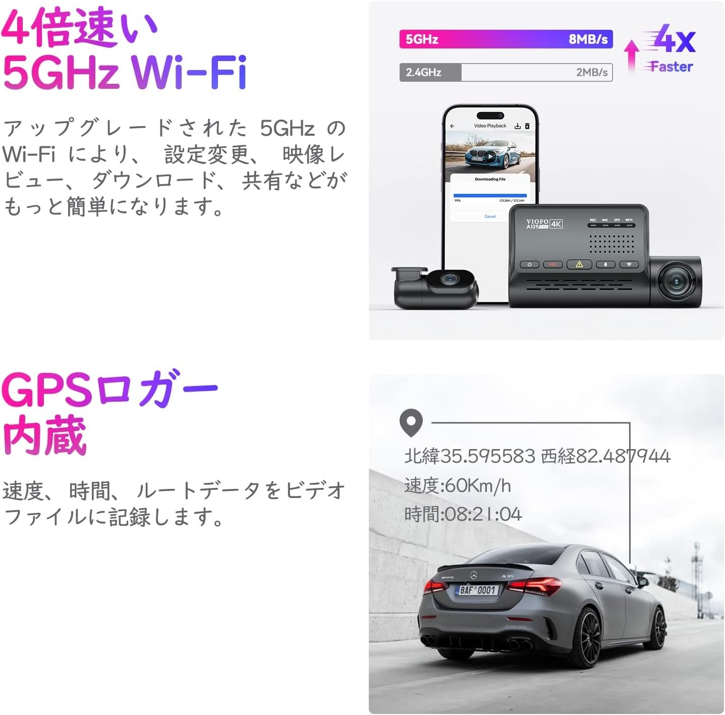 【高速5GHz Wi-Fi&GPS】アップグレードされた5GHz Wi-Fi接続モジュールがA139 Pro 2CHドラレコに内蔵され、最速のWi-Fiデータ転送を実現し、ビデオのプレビュー、ダウンロード、共有をスムーズに行うことができます。前後2カメラは、GPSロガーで現在の速度とGPS位置を記録し、ビデオにタイムスタンプを埋め込むことができます。