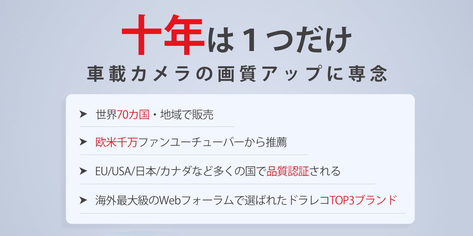 高品質なドライブレコーダーや関連アクセサリーの製造に注力している企業です。2010年の創立以来、常にお客様に最高品質の製品とサービスを提供することに尽力しています。VIOFOのドライブレコーダーは、欧米で上位3社にランクインしており、品質や映像効果に非常に自信があります。高温、低温、湿気、悪路条件下でも、当社の製品は安定した動作をし、クリアで正確な録画映像を提供することができます。