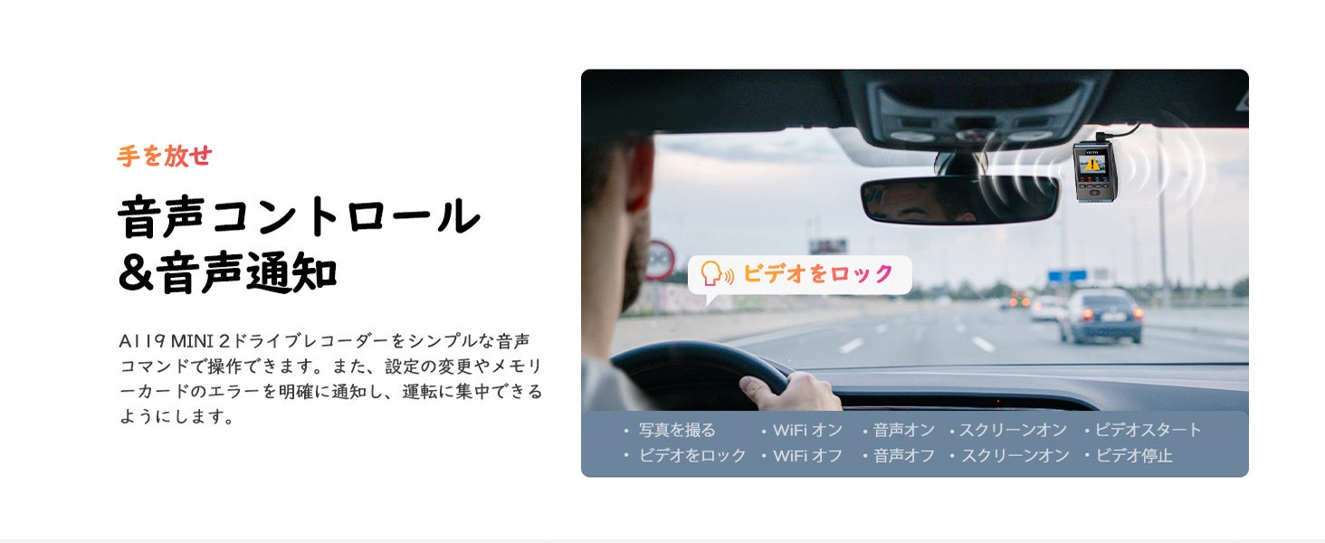 シンプルな音声コマンドを出すだけで、録画の開始/停止、写真撮影、Wi-Fi ON/OFFが可能。設定変更やメモリーカードエラーに関する音声通知機能を装備しております。設定の変更やメモリカードのエラーを明確に通知する音声通知もあります。ハンドルを握り、道路に完全に集中するだけです。音声操作と通知は運転の安全性と利便性をもたらします。