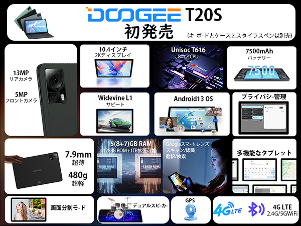 10.4インチ / Android 13 / 15GB(8GB+7GB拡張) RAM+128GB ROM+1TB拡張 / 2K FHD IPSディスプレイ / 13MP+5MPカメラ / WIFIモデル / GPSサポート