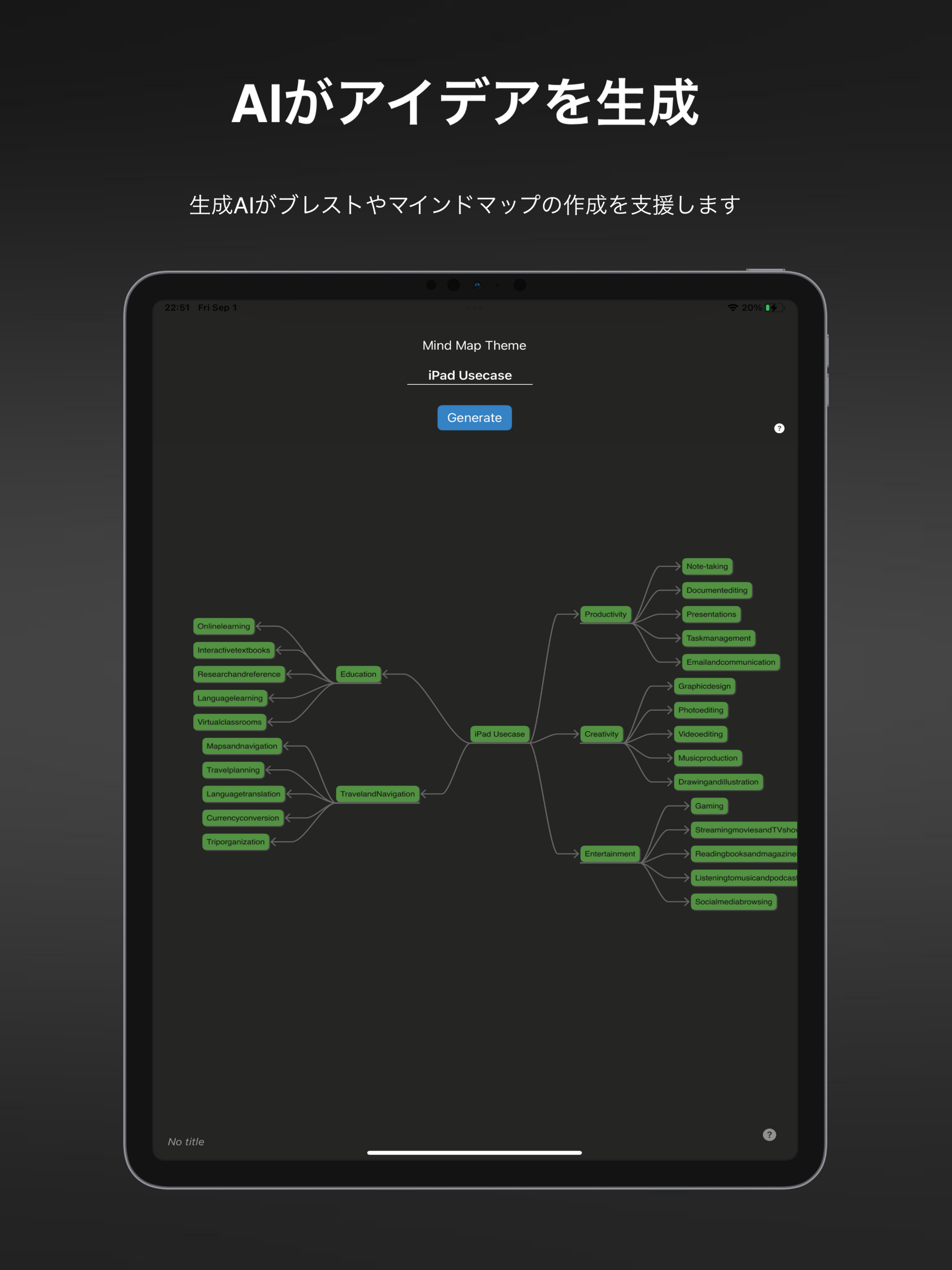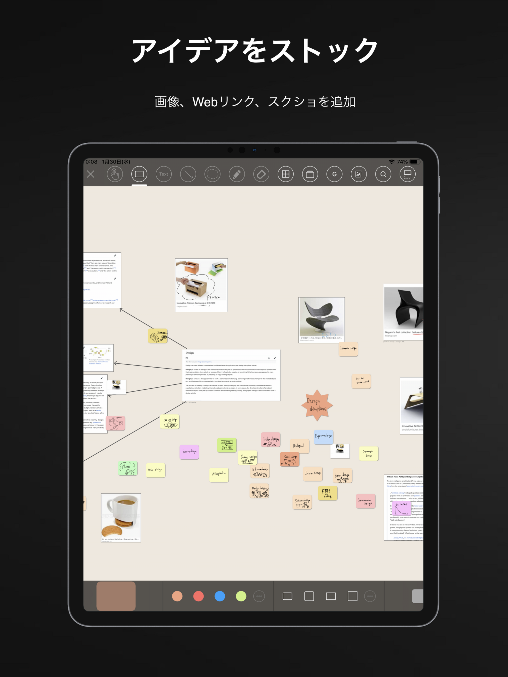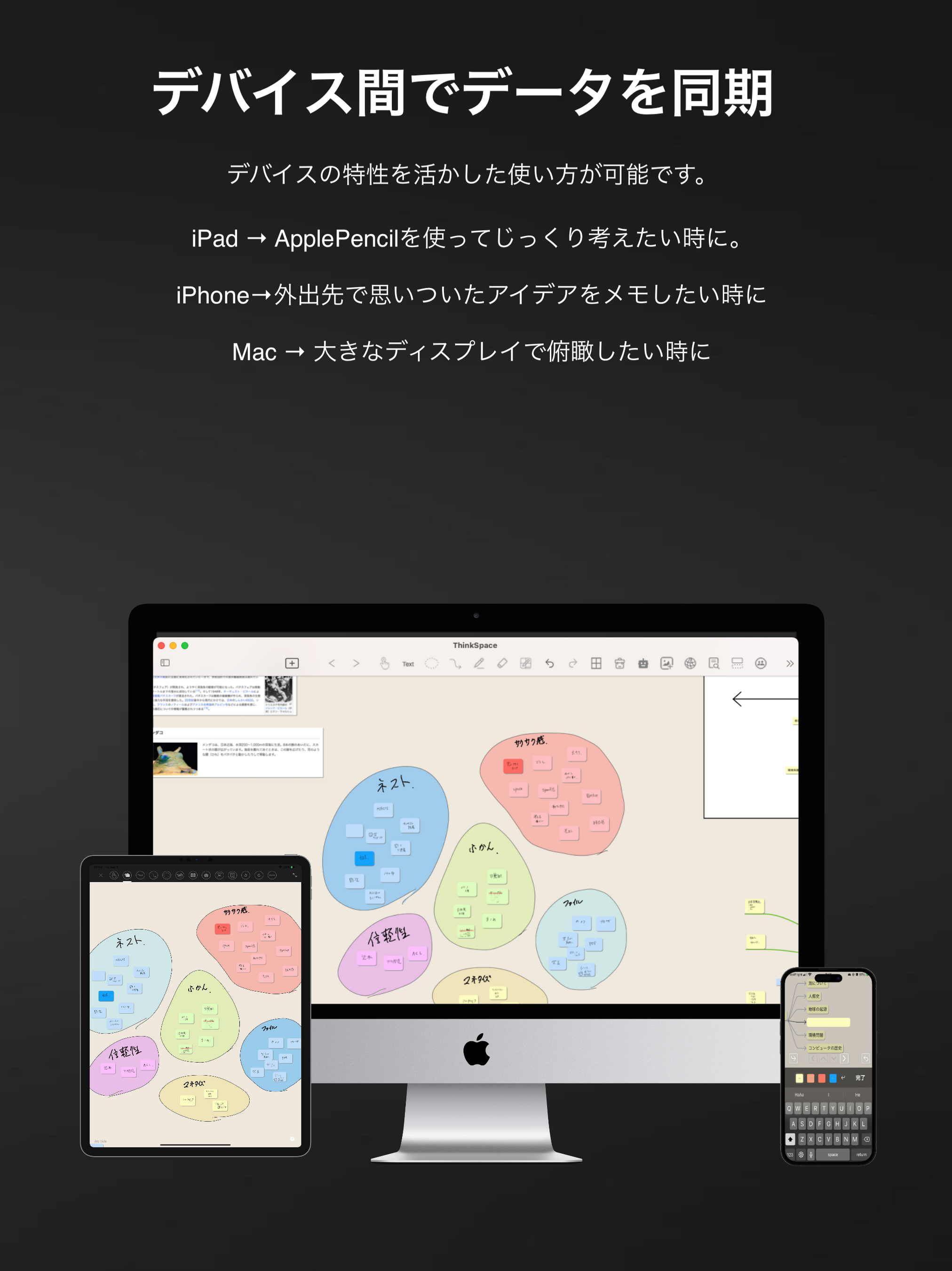 説明:ThinkSpaceは、創造的な思考をサポートする強力なツールです。無限キャンバス上でブレインストーミング、アイデア整理、マインドマップの作成、フローチャートの構築、アイデアの発想法、AIによるブレストやマインドマップ生成、Webブレインストーミング、共有キャンバスによるコラボレーションなど、アイデア創造のあらゆる要素をシームレスに統合しています。 特徴として、自由なブレインストーミングをスムーズに行え、手書きのマインドマップも自由に作成可能なことです。思考を整理するためのグルーピングや関係線もサポートされ、キャンバスのサイズは無限に拡張可能。AIを活用したアイデア生成やマインドマップ作成も可能です。Webページの切り取りや画像の貼り付けも簡単に行え、テキスト検索で必要な情報を見つけ出せます。 また、ThinkSpaceはオフラインでも使用可能で、Pro版ではデータの同期もサポート。共同編集機能も備えており、リモートワークを効果的にサポートします。思考の発展を支え、価値あるアイデアを育てるための頼れるパートナーです。