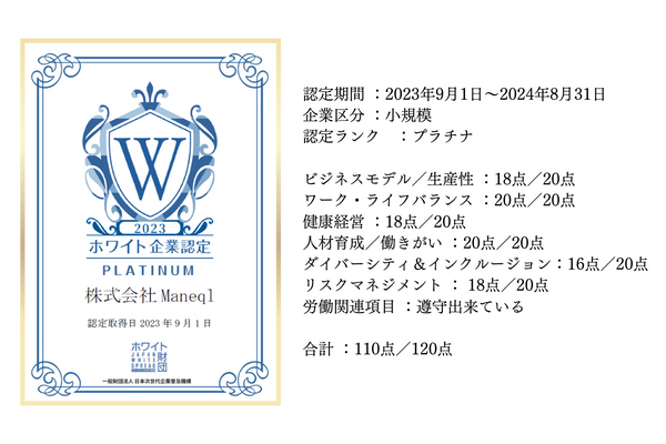 また、定着率ならびに従業員の満足度も高いことから、一度、第三者の視点から評価してもらおうと思い、ホワイト企業認定を取得に至りました。