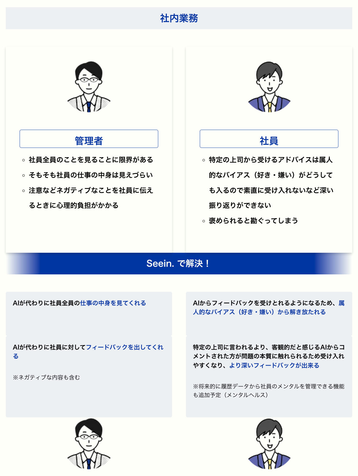 生成AIを活用したWebサービス「Seein.」は、チャット機能やフィードバック機能を通じて、社内の人材ケアと離職防止を強化します。