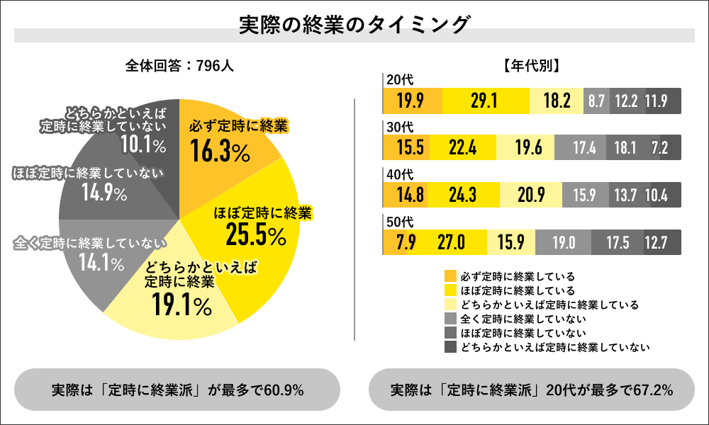 回答者全体の796人に実際の終業タイミングを聞くと「定時に終業派」が60.9%と過半数を占め、内訳は「必ず定時に終業」16.3%、「定時に終業」25.5%、「どちらかといえば定時に終業」19.1%となりました。年代別の回答では20代の「定時に終業」が67.2%で最多となり、次いで40代が60.0%、30代が57.5%、50代が50.8%と、若手層の終業時間が早い結果となりました。