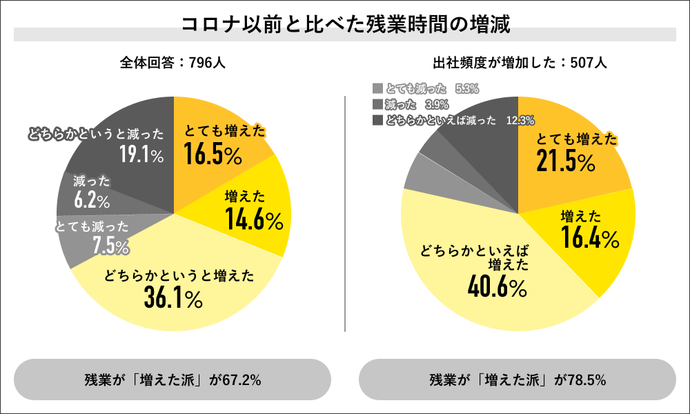 回答者全体の 796人に、コロナ5類移行前と比べた残業時間の増減を聞くと「増えた派」が67.2%と過半数を占め、内訳は「とても増えた」16.5%、「増えた」14.6%、「どちらかといえば増えた」36.1%となりました。またコロナ後に出社頻度が増加した507人に同質問を聞くと「増えた派」が78.5%と過半数を占め、内訳は「とても増えた」21.5%、「増えた」16.4%、「どちらかといえば増えた」40.6%となり、出社頻度が高い人ほど残業時間が増える傾向が見られました。