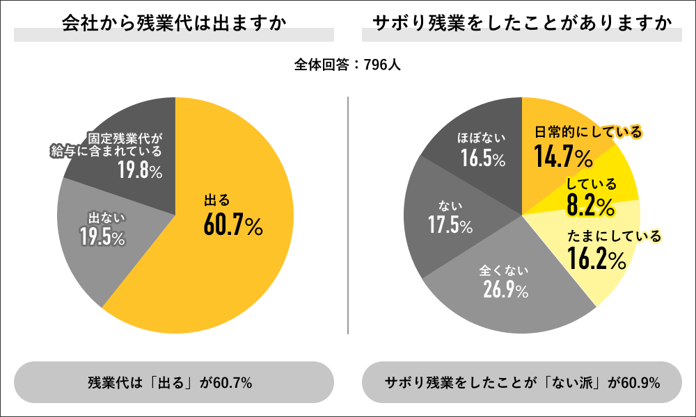 回答者全体の796人に会社からの残業代の有無を聞くと「出る」が60.7%、「出ない」が19.5%、「固定残業代が給与に含まれている」が19.8%と、”出る派”が過半数を占めました。同回答者にサボり残業の経験有無を聞くと「ない派」が60.9%と過半数を占め、内訳は「全くない」26.9%、「ない」17.5%、「ほぼない」16.5%となりました。