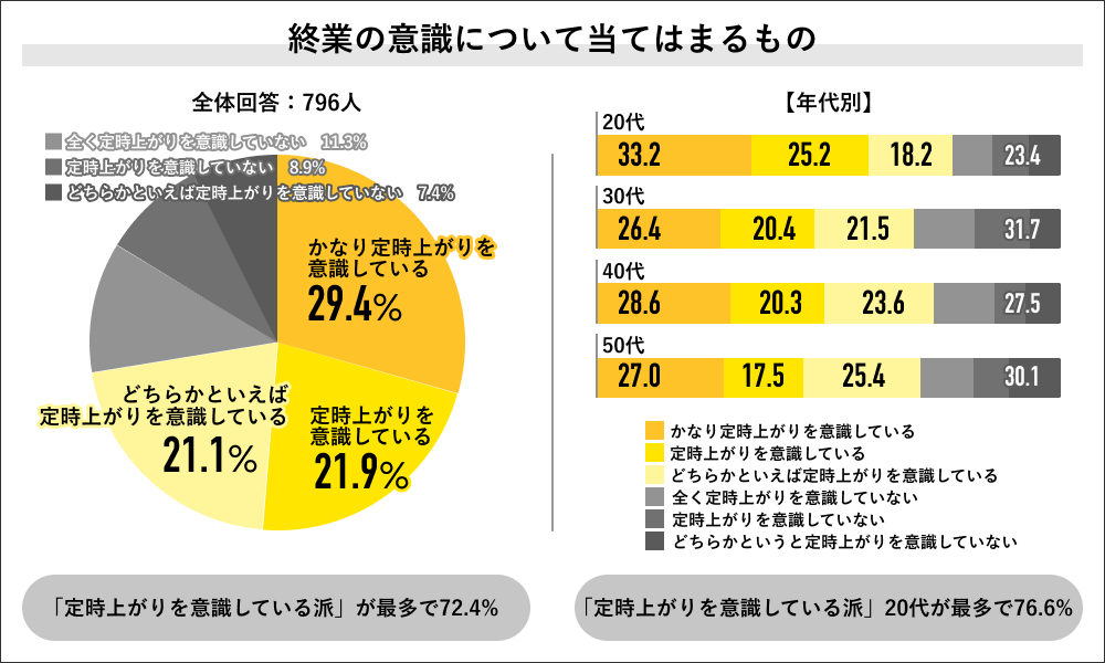 回答者全体の 796人に終業の意識を聞くと、「定時上がりを意識している派」が72.4%と過半数を占め、内訳は「かなり定時上がりを意識している」29.4%、「定時上がりを意識している」21.9%、「どちらかといえば定時上がりを意識している」21.1%となりました。年代別の回答では20代の「定時上がりを意識している派」が76.6%で最多となり、次いで40代が72.5%、50代が69.9%、30代が68.3%と、若手の次に中堅層の意識が高い結果になりました。