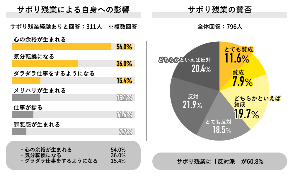 サボり残業経験ありと回答した311人にサボリ残業による自身への影響を聞くと「心の余裕が生まれる」が54.0%で最多回答となり、次いで「気分転換になる」36.0%、「ダラダラ仕事をするようになる」15.4%が上位3つの回答となりました。また全回答者の796人にサボり残業の賛否を聞くと「反対派」が60.8%と過半数を占め、内訳は「とても反対」18.5%、「反対」21.9%、「どちらかといえば反対」20.4%となりました。