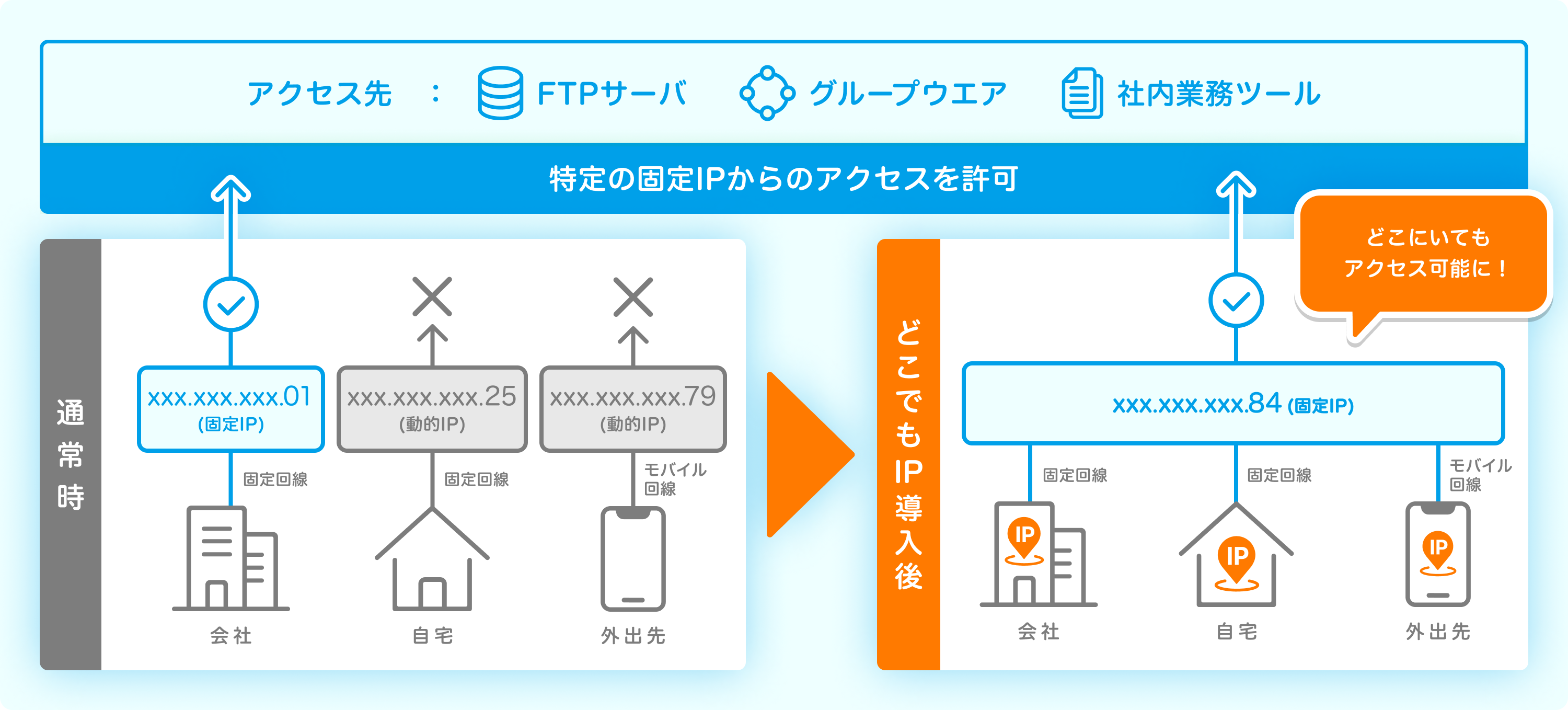 通常出張先や旅行先のホテル、出先のカフェなどといった外出先から、社内ファイルサーバやグループウェア、社内請求システムや踏み台サーバといった社内システム等固定IPを必要とするネットワークへアクセスする際に、セキュアな状態を維持するには手間がかかったり、通信環境が変更される度に設定をし直す必要があったりするという問題がありました。