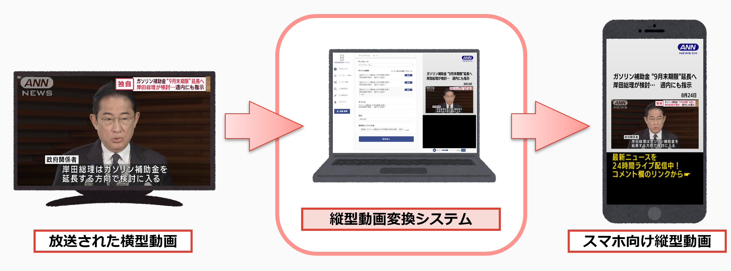 今回開発した「縦型動画変換システム」は、配信先のSNSプラットフォームに応じた縦型デザインの中に、自動で縮小した横型動画と、読み取ったテロップ情報を再配置することが可能です。横型動画を本システムに登録することで、スタッフの手間をかけず短時間で縦型動画を制作することができます。そのため、縦型動画1本あたりの制作時間が大幅に短縮され、1日で制作できる縦型動画の本数増大が期待されます。
