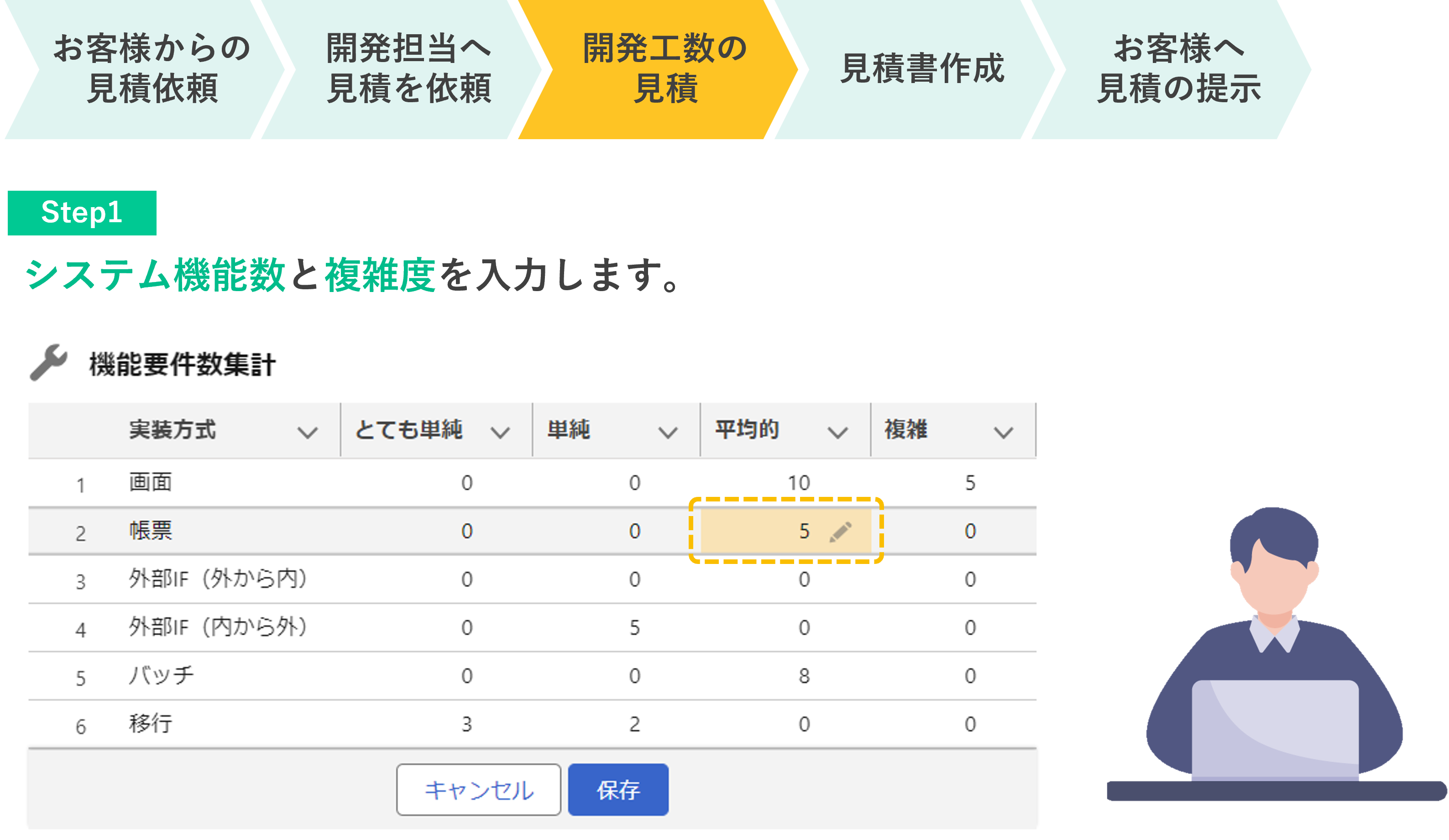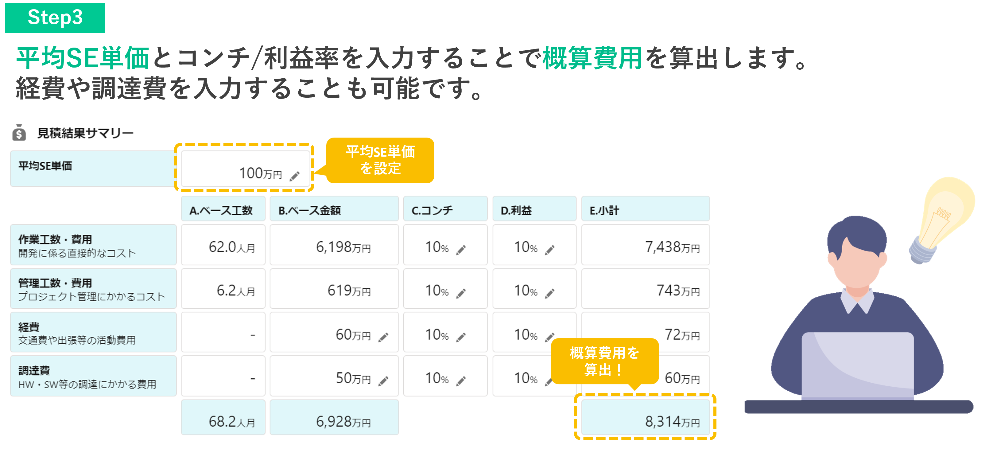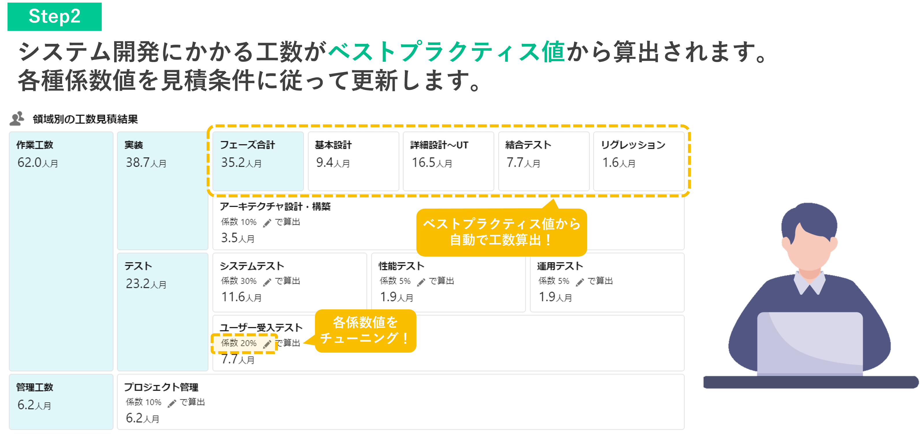 システム機能数と複雑度を入力することで、システム開発にかかる概算工数・費用を算出できます。多数のプロジェクト経験をもとにしたベストプラクティス値を利用して、誰でも品質の高い見積が可能です。