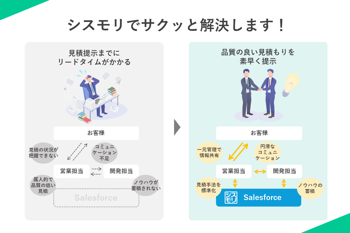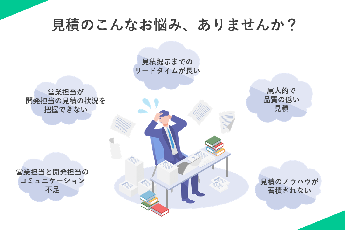 システム開発の受注プロセスにおいて「見積」は売上に直結する重要なフェーズです。しかし、見積は属人的になりやすく、品質の担保が困難です。また、営業担当と開発担当のコミュニケーションがうまく取れず、見積提出までのリードタイムが長くなり、受注につながらないといった課題を抱えている企業も多くあります。