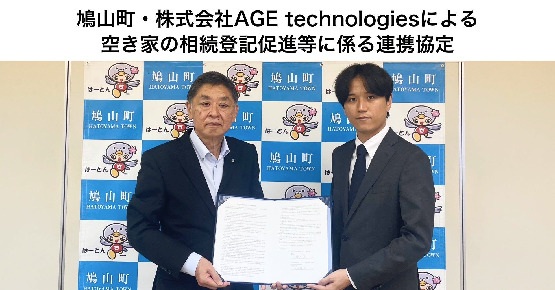 「様々な取り組みの積極展開を通じ、空き家対策を強化される鳩山町さまと、空き家の相続登記促進等に係る連携協定を締結できたことを光栄に思います。弊社が展開する、煩雑な各種相続手続きの課題を解決に向けたWebプラットフォーム、我々の知見やデータをフル活用することで、鳩山町における課題解決に寄与できるよう尽力して参ります」(AGE technologies代表取締役CEO 塩原優太)