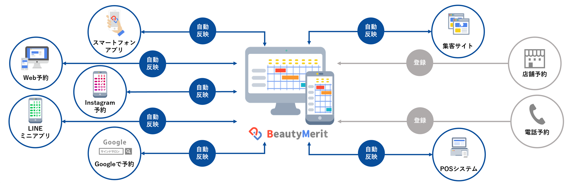 美容室・美容サロンがお客様からのご予約を受け付ける集客サイトや店舗のホームページ、当社が提供する公式オリジナルアプリ等から予約情報を取得し、一つの管理画面で管理ができる仕組みです。従来は、それぞれの集客サイトの管理画面から、予約情報やスタッフのシフト情報を更新する必要があるため、非常に管理が煩雑となっております。