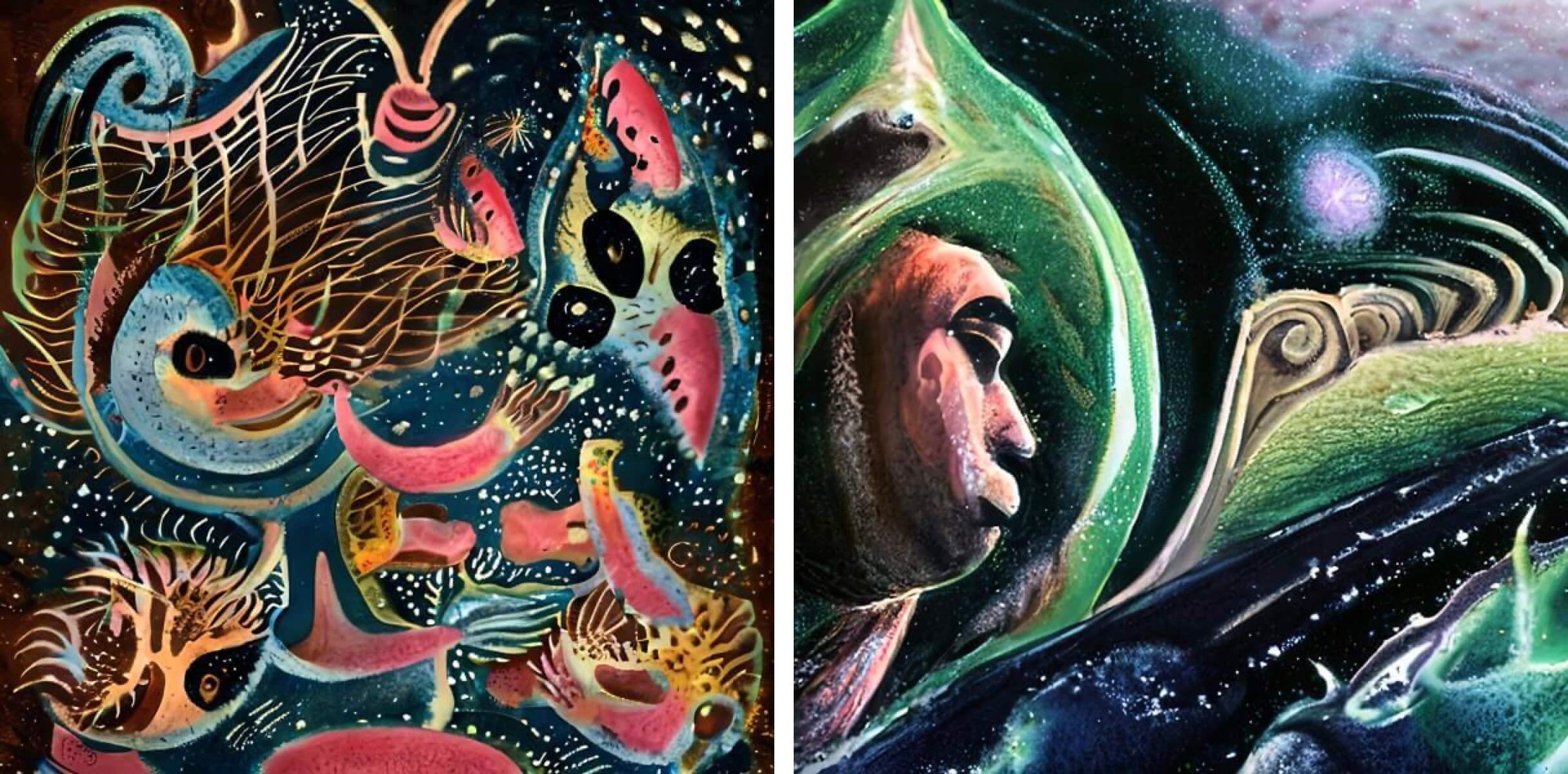 【抽象画的な画像が中心】AI アート作家の多くは写真やアニメ画像のようなリアルな画像を作っていて,画像生成 AI もそれにあわせてより人体などのリアルな画像が作れるようにしています.しかし,実は画像生成 AI は人体など実世界のものの構造に関する知識ももたないため,リアルな画像をつくるのには適していません.人間でも不得意な能力をおぎなうより得意な才能をのばすのがよいといわれますが,AI でも同様だとかんがえています.そこで,デイシンでは絵画的とくに抽象画的な画像を中心に作らせています.