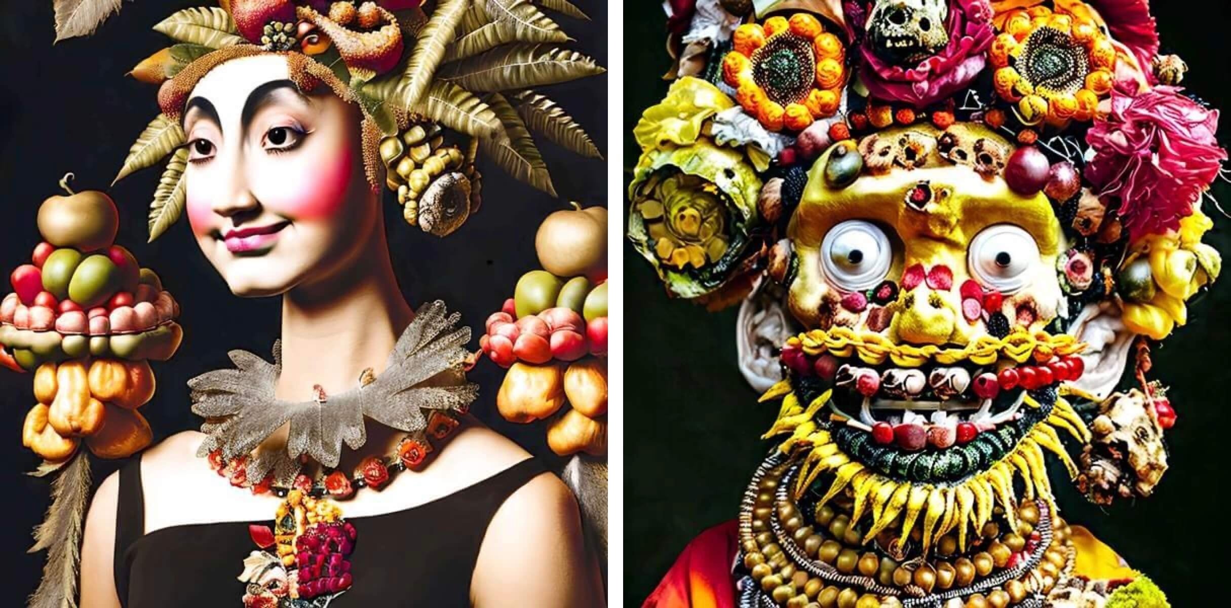 クリムト,カンディンスキーとともにゆたかな画像をつくりだす画家名としてアルチンボルド (Arcimboldo) があります.ルネサンス期の特異な画風をもった画家です.その名前をクリムトの名前とともに正負のプロンプトに指定して作ったどちらの画風ともちがう絵 (https://bit.ly/4499w85) と,アルチンボルドの名前を正のプロンプトだけに指定し負のプロンプトとしてルーベンス,ゴッホ,マグリットの名前を指定して得られた 3 枚の絵 (https://bit.ly/45KiVoi, https://bit.ly/3PzQROR, https://bit.ly/486Fkh3) を例示します.