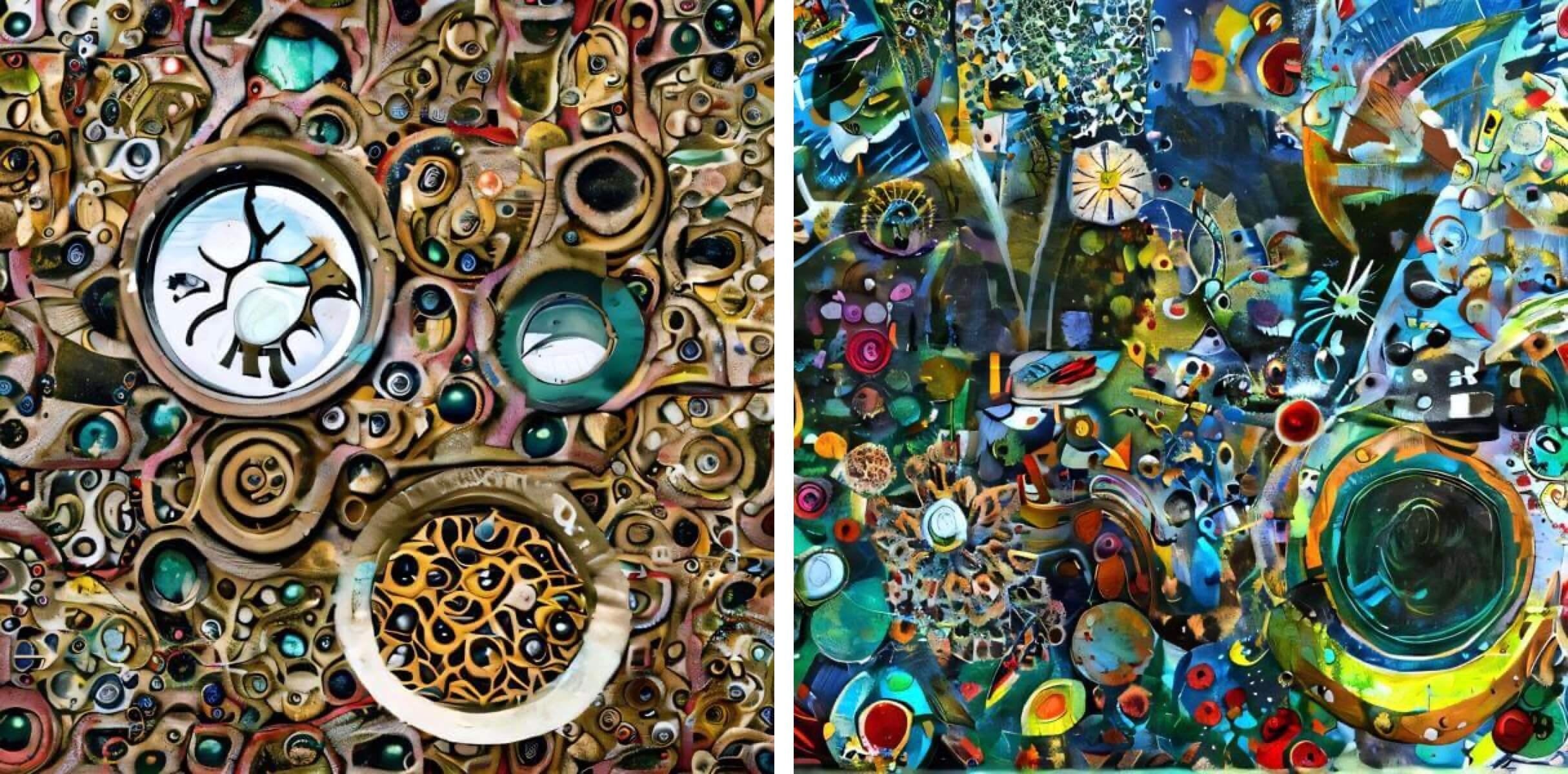「無限 (infinity)」や「微分 (differentiation)」は数学用語ですが,それら,またはそのつづりをすこし変えたものをあたえると,興味深い絵がえられます.左下の絵はクリムトの名前ともに「無限」をあたえて描かせました (https://bit.ly/3YMqxUJ).また右下の絵は近代の画家カンディンスキーとクリムトの共作風つまり 2 人の名前をともに正負のプロンプトにあたえ,さらに “differentia” ということばをあたえたものです (https://bit.ly/3Yzx1pS).数学だけでなく,さまざまな科学技術用語からさまざまな絵が生成されます.