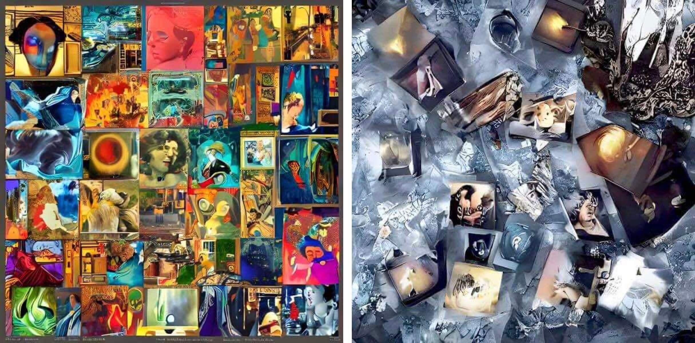 画像生成 AI はしばしばコラージュ的な作品をうみだします (https://bit.ly/3YtiFHr).つまり,多くの画像を積み重ねたような画像がつくられます.左下のように向きが比較的そろっている場合もあり (https://bit.ly/3Lg3JHc),右下のように向きがさまざまな画像がかさなる場合もあります (https://bit.ly/3PwzYEr).さらに,切り抜いたような自由な形の画像がかさなる場合もあります (https://bit.ly/467QEHS, https://bit.ly/3EwzxUz).