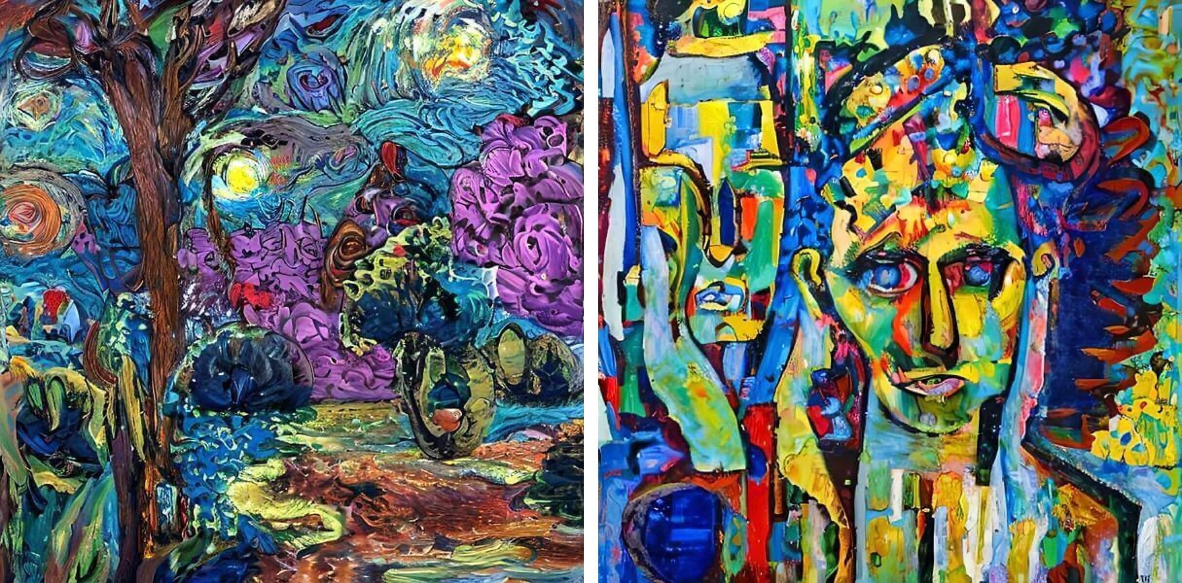 「表現主義 (Expressionism)」のような芸術運動名を正のプロンプトに指定することでそのスタイルの絵を生成することができますが,さらにおなじことばを負のプロンプトにも指定すると画家名の場合と同様に多様な絵がえられます (https://bit.ly/445gDyu).左下の絵は「シン表現主義 (Shinexpressionism)」という架空の芸術運動名を正負のプロンプトに指定してえられた例です (https://bit.ly/45ry1yg).ゴッホの「星月夜」にちかい部分もありますが,かなりのちがいがあるオリジナルな絵です.また,右下の絵はクレッショニズム (Cressionism) という架空の芸術運動名からつくられました (https://bit.ly/47tyrpK).つづりを一部だけ変えることで表現主義的でありながら多様な画風がうみだされます.