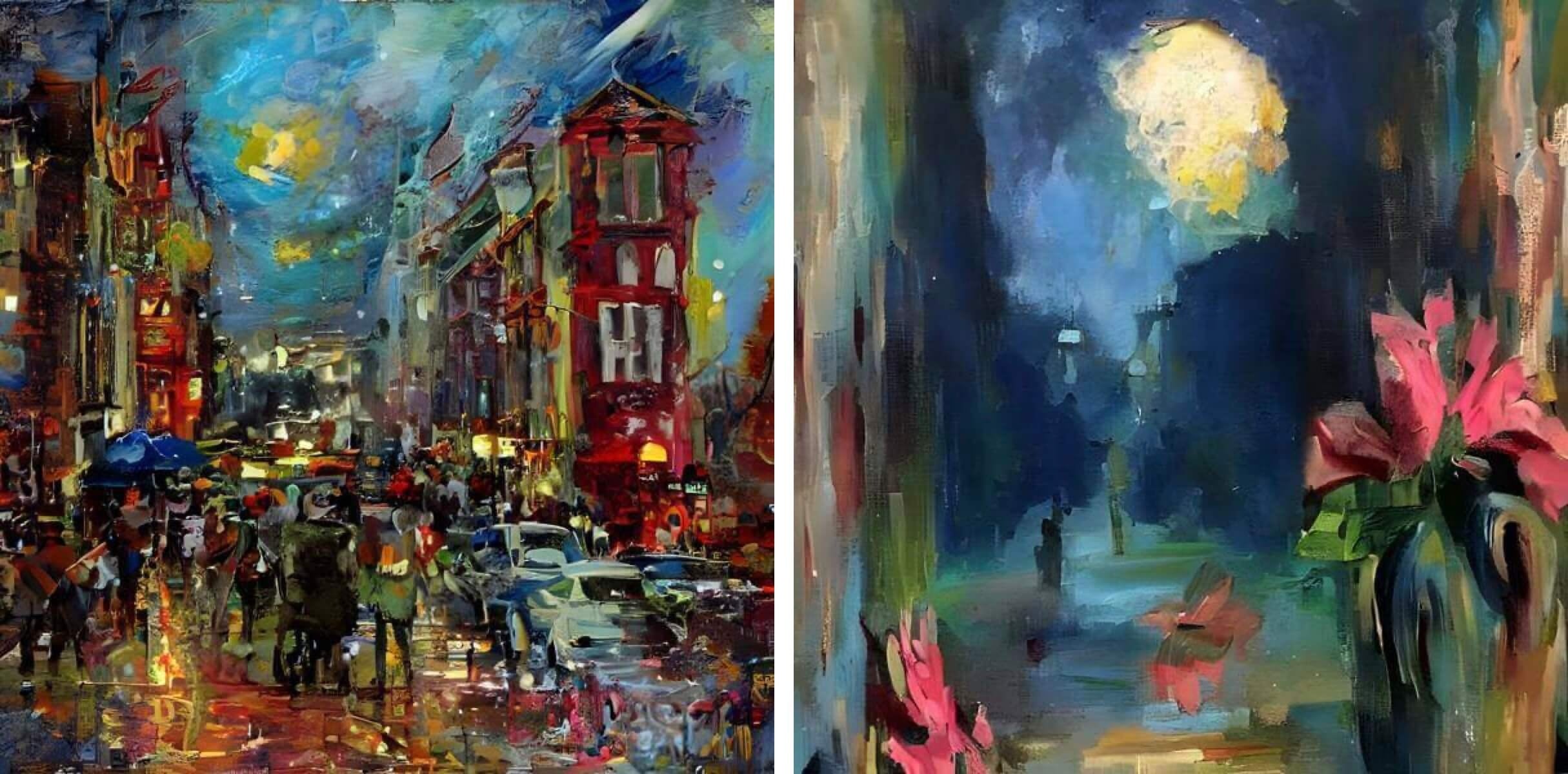 また,つぎの絵においては負のプロンプトとして芸術運動名を指定することで画風が変容しました.アフレモフという現代画家はカラフルな色の特徴的なタッチの絵を描きますが,その名前 (Afremov) やそれにちかいつづりを正のプロンプトにあたえ,さまざまな芸術運動名を負のプロンプトとしてあたえると,アフレモフとはことなる,さまざまな絵を描きます (https://bit.ly/3s52rIh).左下の絵は負のプロンプトとして「表現主義」をあたえた結果,色がずっとおとなしくなっています.一方で負のプロンプトとして「フォービズム (Fauvism)」をあたえると,右下のようにアフレモフの絵に似てカラフルであるものの,タッチはアフレモフとかなりちがう絵がえられました.