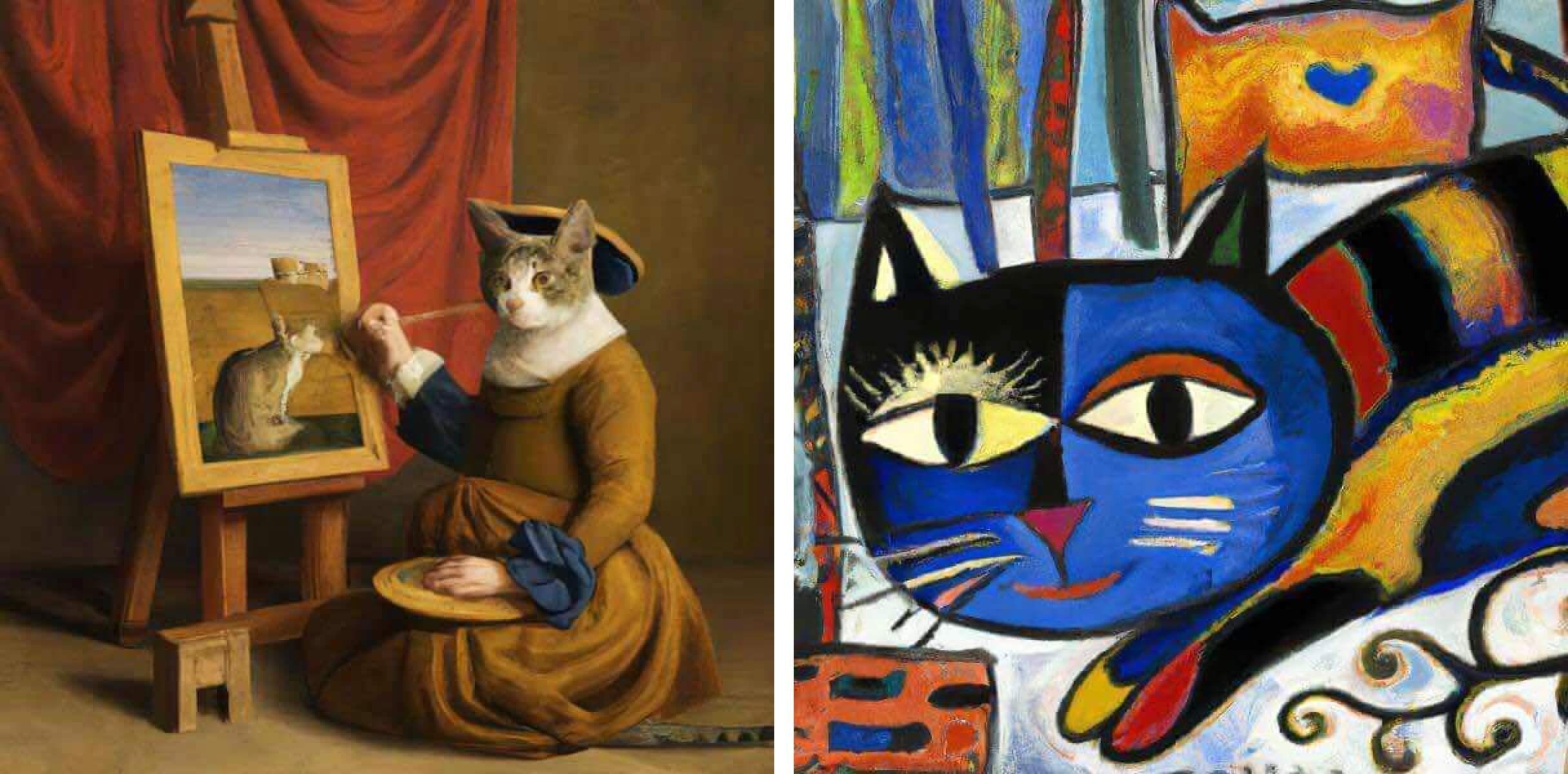 キャットアートについては昨年 12 月のニュースリリースにも書きましたが,再度,例示します (https://bit.ly/3Pb5eaS).左下はフェルメールと猫を指定することで,猫の絵を描く猫が描かれたもの,右下はシャガールと猫を指定してえられたものです.