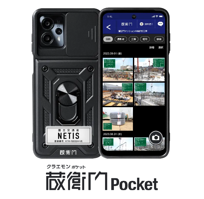 第2世代の『蔵衛門Pocket』は、足場の悪い現場で安心して携帯でき、万が一の衝撃にも備えられるカメラスライドカバーつき堅牢ケースとネックストラップを付属。画面も高強度なパンダガラスを採用しています。施工管理アプリ『蔵衛門クラウド』も標準搭載しているので、届いたその日から現場で使いはじめることが可能です。写真を撮って工事関係者とリアルタイム共有したり、電子小黒板入り写真の撮影はもちろん、図面や写真にマーカーを入れて指示出しができます。SIMフリー端末のため、音声SIMを挿入することで、一般の電話としても利用可能。『蔵衛門Pocket』は、場所や時間を選ばず写真や図面等の書類を共有でき、現場監督からすべての作業員までのコミュニケーションをスムーズにします。
