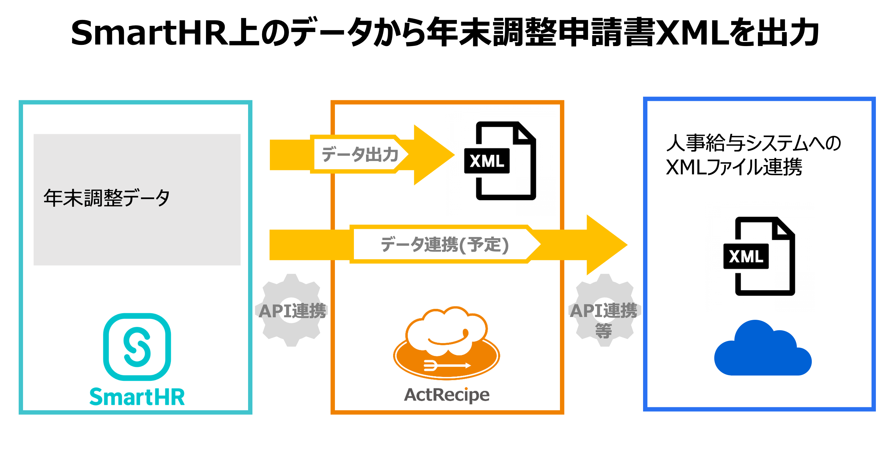 これまで「SmartHR」で行った年末調整のデータを外部の人事給与システム等へ取り込むには、「SmartHR」からダウンロードしたCSVファイルを個別にデータ変換する必要がありました。今般の対応により、「SmartHR」の年末調整データを用いて国税庁が定める「年末調整申告書XMLデータ」(※)としてファイル出力することが可能となりました。このファイル出力機能は、ITの複雑な知識を必要としない「レシピ」というマイクロSaaSによって実装しておりますので、人事ご担当の方でも手軽にご利用いただけます。該当の「レシピ」は無償でご利用いただけるActRecipeのFreeプランにてご提供予定です。