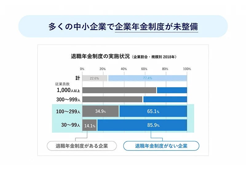 日本の全企業数のうち、中小企業数は99.7%、中小企業で働く従業員数は68.8%*¹と非常に多い中、その多くが退職給付制度を実施していない*²状況にあります。