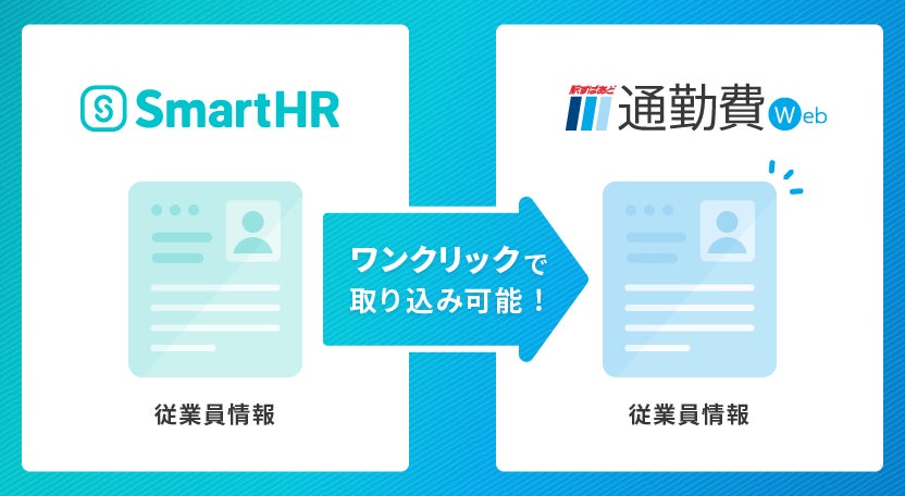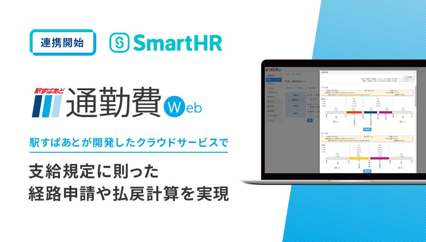 今回の連携により、「SmartHR」で管理されている従業員の情報を「駅すぱあと 通勤費Web」へスムーズに取り込めます。また、入社時に従業員の「SmartHR」アカウントが発行されると、そのアカウント情報を利用してそのまま「駅すぱあと 通勤費Web」へログインが可能となります。これにより、従業員は自ら自社の規定に照らし合わせた通勤経路の選択・申請が行えます。さらに「駅すぱあと 通勤費Web」は、既に導入されている給与計算システムや勤怠管理システムなど多数の他社サービスとも連携が可能なため、併用することで業務効率化に繋がります。